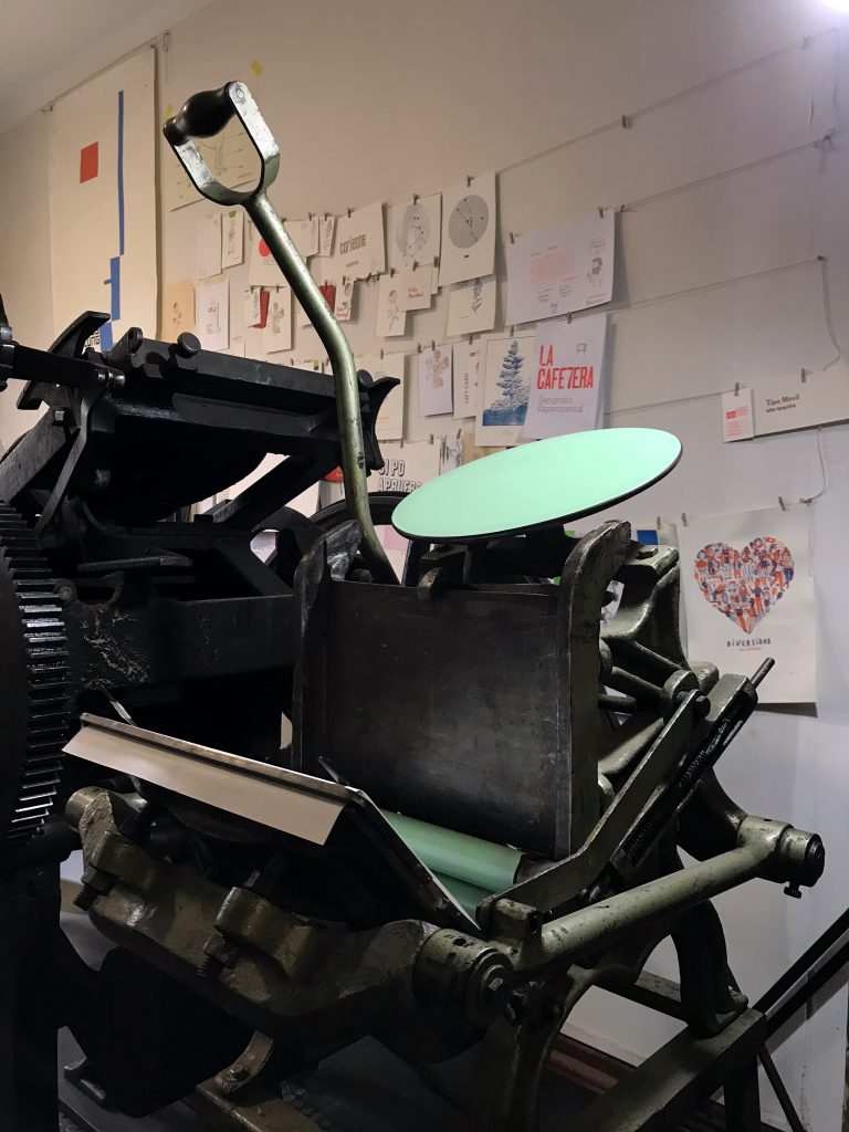 En este proceso se utilizó: 4 colores de tinta, espátula, tipos móviles, papel y prensa tipográfica. Se imprimieron en total 8 diseños distintos, 100 copias de cada uno.