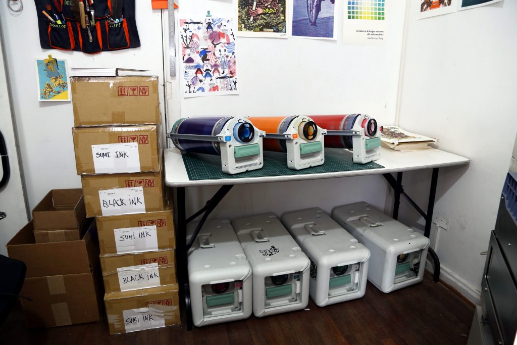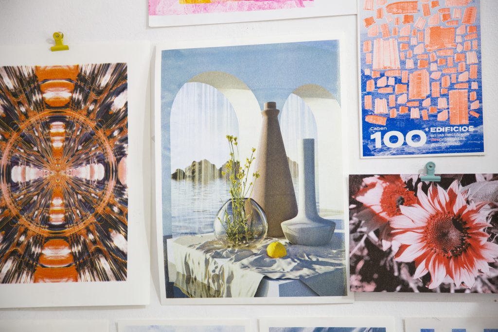 Para varias de las imágenes del proyecto se imprimió el canal negro en algún color de tinta distinta como rojo o turquesa. Este efecto es muy interesante en risografía ya que al no leer los colores de manera automática desde el archivo se pueden intercambiar a gusto y experimentar ampliamente.