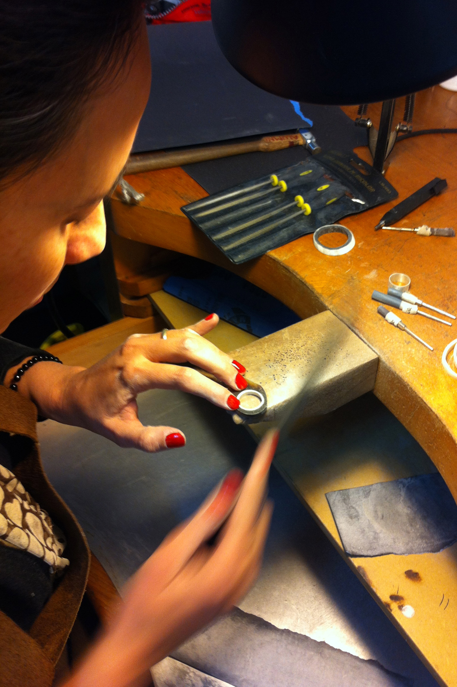 Yo, por mi lado, me fascino con este material, con la vetas, con los colores, con las posibilidades que empiezo a ver en los cortes, en las láminas, en el proceso de moldeado del material, y se me ocurre llevarlo a mi imaginario, a mi manera de hacer, a mi escala, y lo transformo en pequeños objetos portables, en joyas. Al principio no usaba el metal, sólo el cacho de buey, y como soporte utilizaba cordones, cuerdas, cuero, y funcionaba bastante bien. El resultado final de esa colección fue mostrado en la revista Elle el año 2004, y ahí empiezan los pedidos, no paran. Yo decido agregarle más valor al material y en esa búsqueda encuentro la plata, encuentro el metal. Entonces decido aprender a trabajar el metal: fui aprendiendo con maestros joyeros tradicionales, primero, en talleres de joyería antiguos, donde el aprendizaje al principio fue casi mirando.