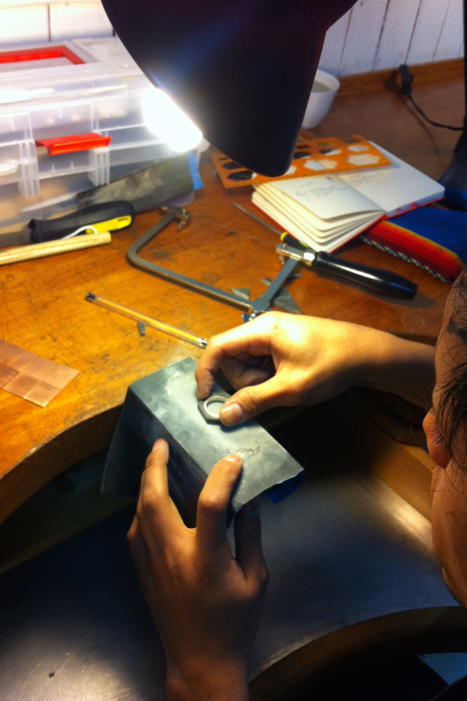Así empecé una búsqueda autodidacta, y leyendo libros. Comencé a tratar de poner la técnica de la joyería al servicio de mi necesidad, que era construir soportes metálicos para mis piezas preciadas de cacho de buey. Así surge la idea. Y seguí trabajando, seguí investigando, seguí experimentando en el material con mi papá. Los dos juntos nos hicimos mucho más cercanos en el taller, y con mi abuelo también: ya teníamos un diálogo en común, entonces nos hicimos mucho más amigos, y fue más entretenido también, para él y para mí, no estar solos. En esta experimentación fuimos descubriendo juntos, fuimos creando herramientas —porque tampoco existían muchas— o adecuándolas; máquinas para cortar madera, las adecuamos para cortar cacho; y así, hasta que ya la técnica, los años de oficio, las horas de trabajo, se pueden ver, se pueden rastrear en el resultado final.
